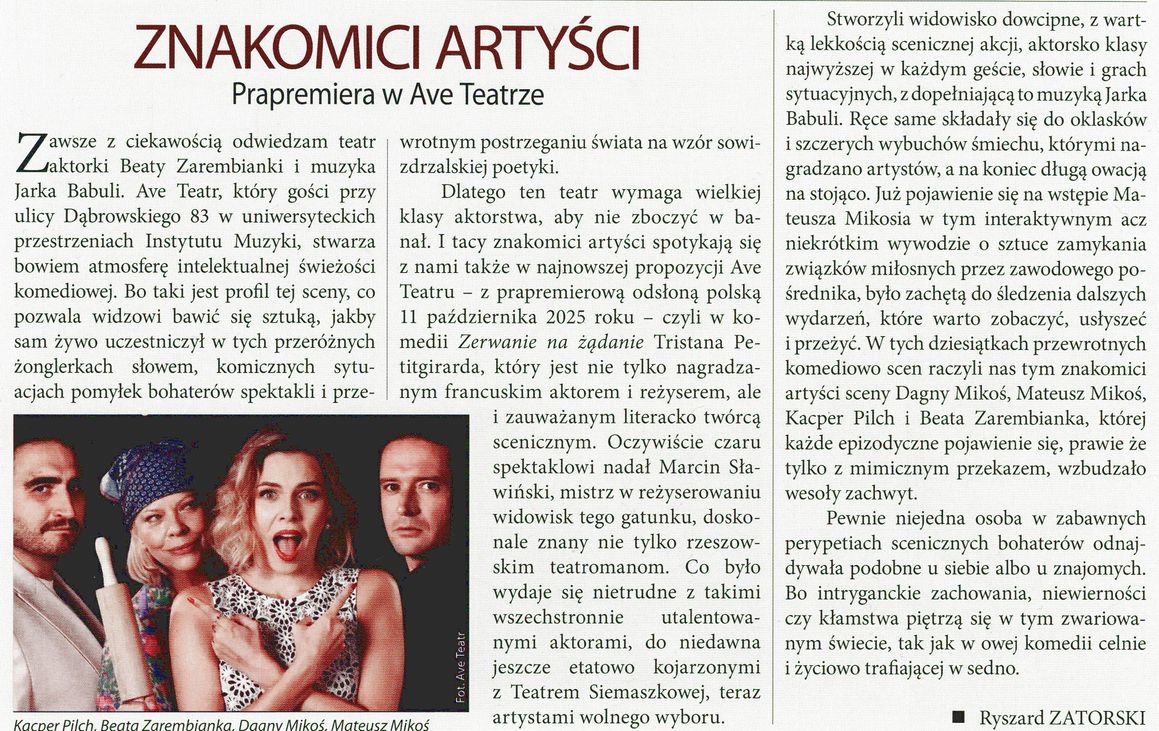Ich troje i sąsiadka. Recenzja Andrzeja Piątka - DZIENNIK TEATRALNY czytaj dalej... ZNAKOMICI ARTYŚCI Prapremiera w Ave Teatrze. Recenzja Ryszarda Zatorskiego - NASZ DOM RZESZÓW czytaj dalej... KOMENTARZE I OPINIE WIDZÓW czytaj dalej... |